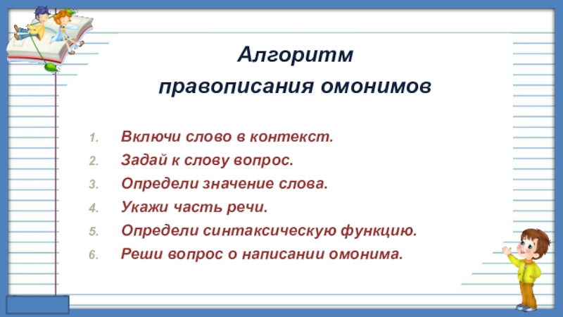 Алгоритм правописания омонимовВключи слово в контекст.Задай к слову вопрос.Определи значение слова.Укажи часть речи.Определи синтаксическую функцию.Реши вопрос о