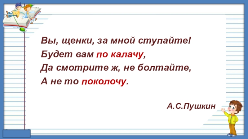 Вы щенки за мной ступайте!Будет вам (по)кал…чу,Да смотрите ж, не болтайте,А не то (по)кол…чу.А.С.Пушкин