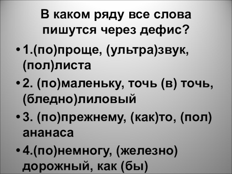 Слайд 27В каком ряду все слова пишутся через дефис?