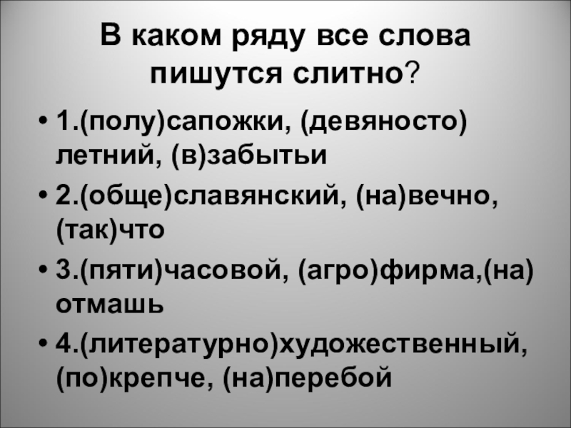 1.(полу)сапожки, (девяносто)летний, (в)забытьи