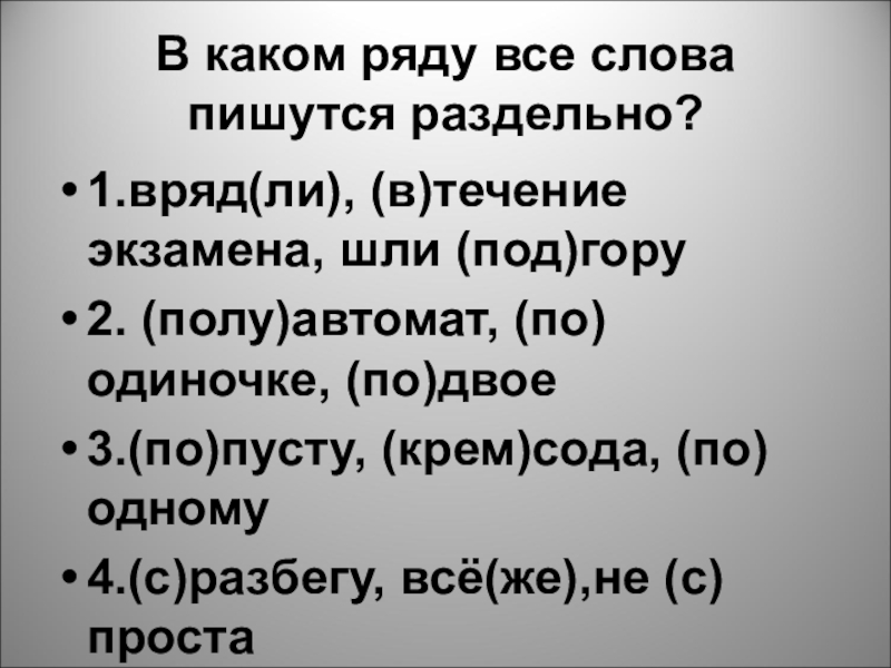 1.вряд(ли), (в)течение экзамена, шли (под)гору