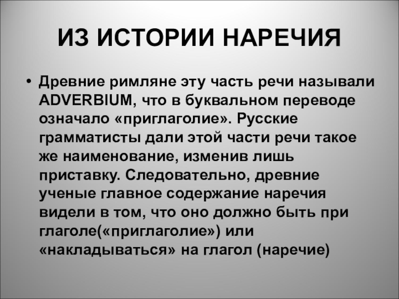 буквальном переводе означало «приглаголие». Русские грамматисты дали этой части речи такое же наименование, изменив лишь приставку. Следовательно, древние ученые главное содержание наречия видели в том, что оно должно быть при глаголе(«приглаголие») или «накладываться» на глагол (наречие)