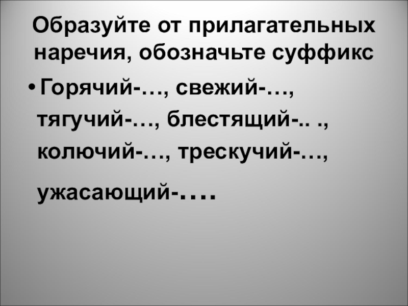 Слайд 21Образуйте от прилагательных наречия, обозначьте суффикс