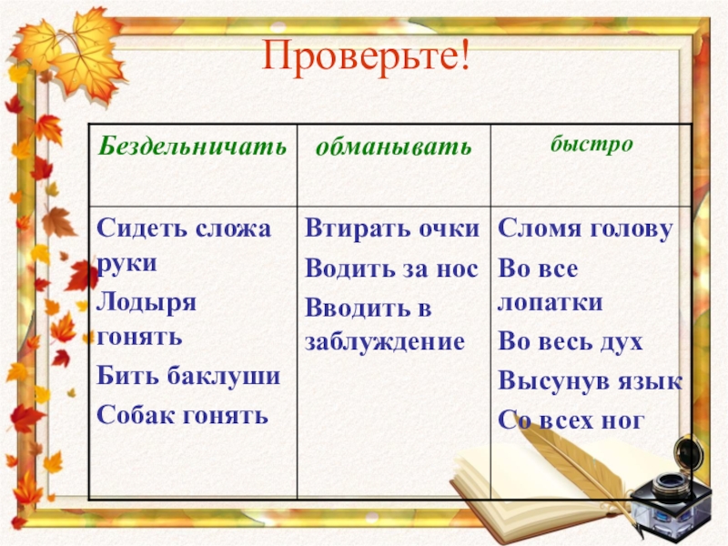 Сломя голову, сидеть сложа руки, втирать очки, во все лопатки, лодыря гонять, бить баклуши, водить за нос, во весь дух, собак гонять, вводить в заблуждение, высунув язык, со всех ног.