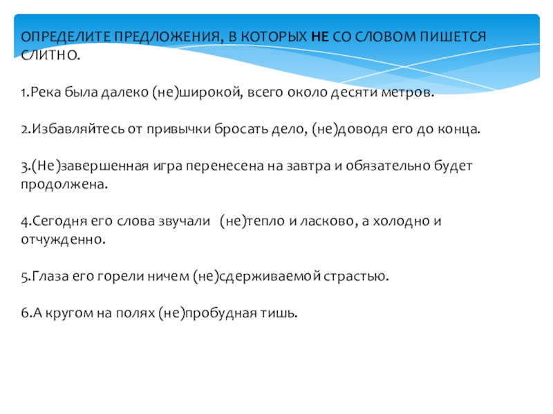 Слайд 11ОПРЕДЕЛИТЕ ПРЕДЛОЖЕНИЯ, В КОТОРЫХ НЕ СО СЛОВОМ ПИШЕТСЯ СЛИТНО.