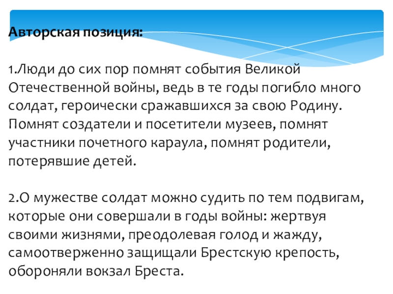 2.О мужестве солдат можно судить по тем подвигам, которые они совершали в годы войны: жертвуя своими жизнями, преодолевая голод и жажду, самоотверженно защищали Брестскую крепость, обороняли вокзал Бреста.