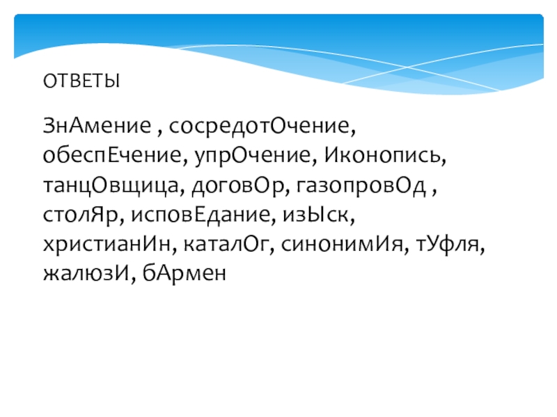 исповЕдание, изЫск, христианИн, каталОг, синонимИя, тУфля, жалюзИ, бАрмен