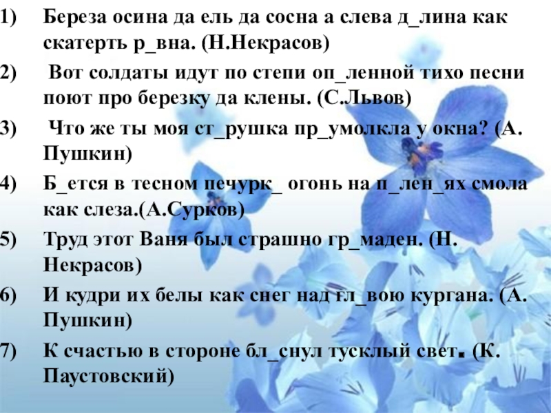Береза осина да ель да сосна а слева д_лина как скатерть р_вна. (Н.Некрасов) Вот солдаты идут по