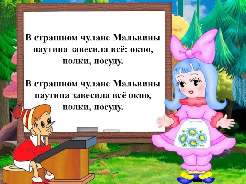 Слайд 6В страшном чулане Мальвины паутина завесила всё: окно, полки, посуду. В страшном