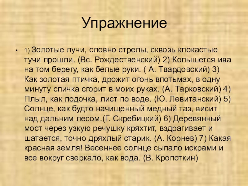 2) Колышется ива на том берегу, как белые руки. ( А. Твардовский) 3) Как золотая птичка, дрожит огонь впотьмах, в одну минуту спичка сгорит в моих руках. (А. Тарковский) 4) Плыл, как лодочка, лист по воде. (Ю. Левитанский) 5) Солнце, как будто начищенный медный таз, висит над дальним лесом.(Г. Скребицкий) 6) Деревянный мост через узкую речушку кряхтит, вздрагивает и шатается, точно дряхлый старик. (А. Корнев) 7) Какая красная земля! Весеннее солнце сыпало искрами и все вокруг сверкало, как вода. (В. Кропоткин)