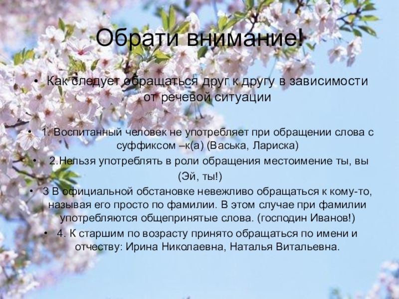 Обрати внимание!Как следует обращаться друг к другу в зависимости от речевой ситуации1. Воспитанный человек не употребляет при