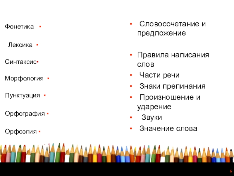Фонетика   ▪  Лексика  ▪                                         Синтаксис▪                                       Морфология  ▪                                  Пунктуация  ▪                                  Орфография ▪ Орфоэпия ▪                                   Словосочетание и предложениеПравила написания слов Части речи Знаки препинания Произношение и ударение  Звуки Значение