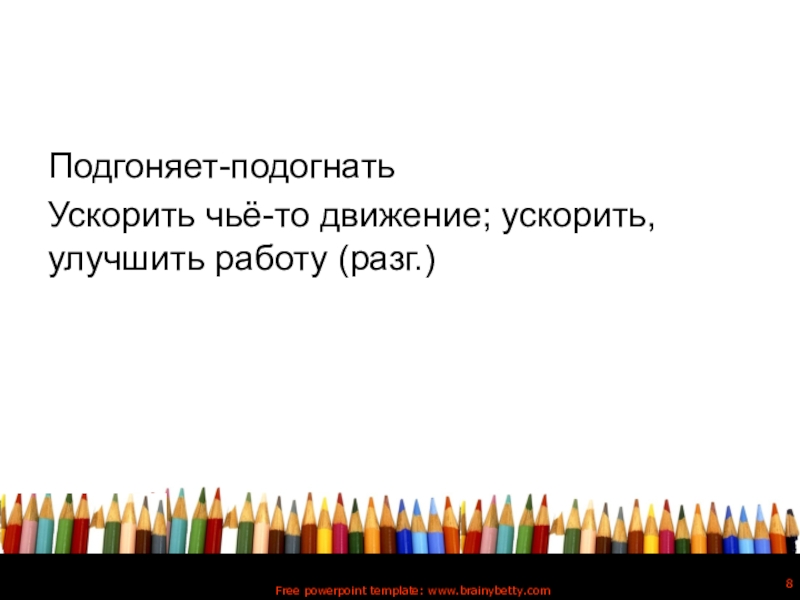 Подгоняет-подогнатьУскорить чьё-то движение; ускорить, улучшить работу (разг.)Free powerpoint template: www.brainybetty.com