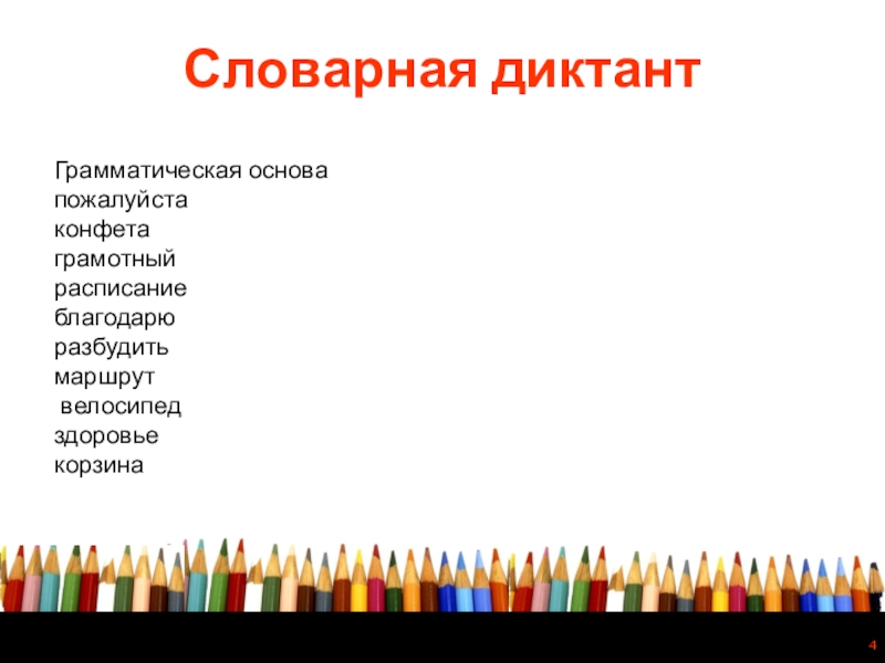 Словарная диктантГрамматическая основапожалуйстаконфетаграмотныйрасписаниеблагодарюразбудитьмаршрут велосипедздоровьекорзина