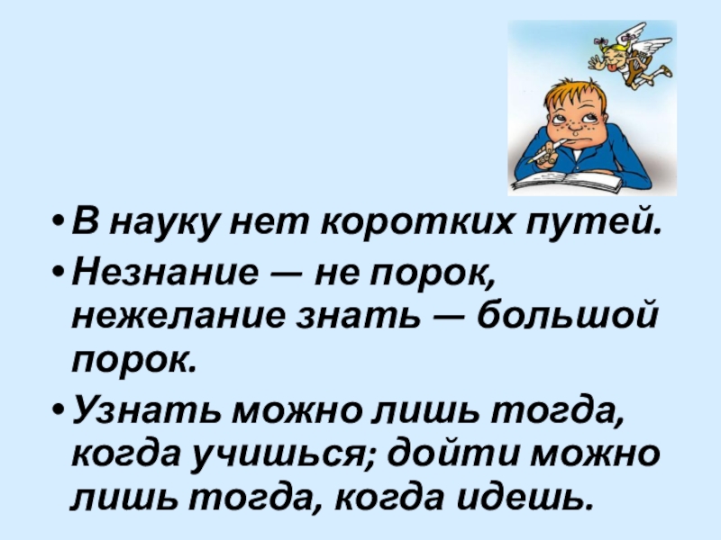 В науку нет коротких путей. Незнание — не порок, нежелание знать — большой порок.Узнать можно лишь тогда, когда учишься; дойти