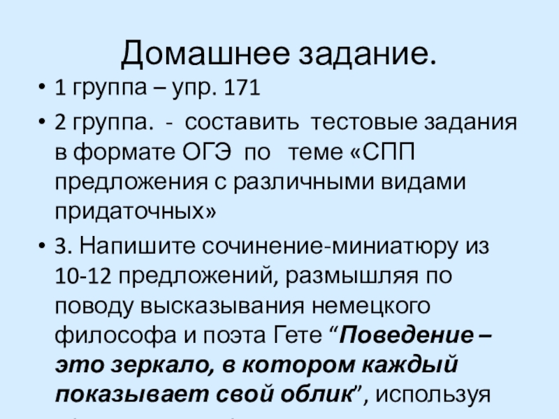 Домашнее задание.1 группа – упр. 1712 группа. - составить тестовые задания в формате ОГЭ по  теме