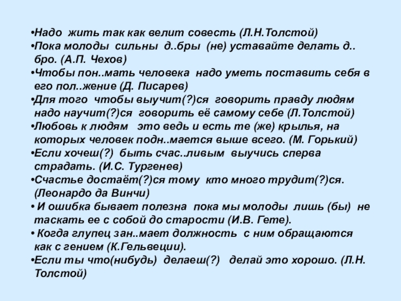 Надо жить так как велит совесть (Л.Н.Толстой)Пока молоды сильны д..бры (не) уставайте делать д..бро. (А.П. Чехов) Чтобы