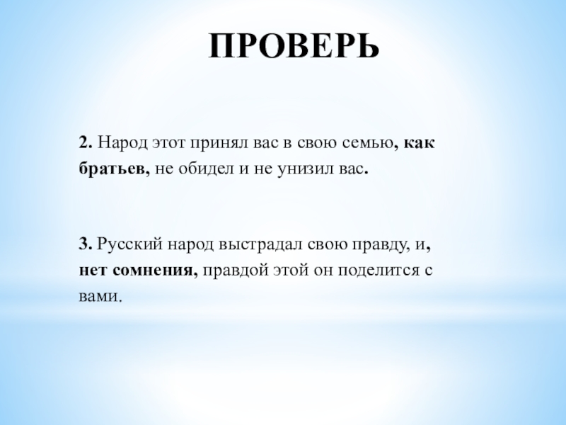 ПРОВЕРЬ2. Народ этот принял вас в свою семью, как братьев, не обидел и не унизил вас.3. Русский