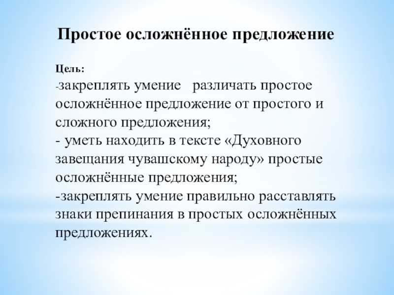простого и сложного предложения;   - уметь находить в тексте «Духовного завещания чувашскому народу» простые осложнённые предложения; -закреплять умение правильно расставлять знаки препинания в простых осложнённых предложениях.