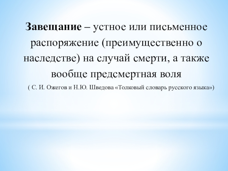 Слайд 4Завещание – устное или письменное распоряжение (преимущественно о наследстве) на случай