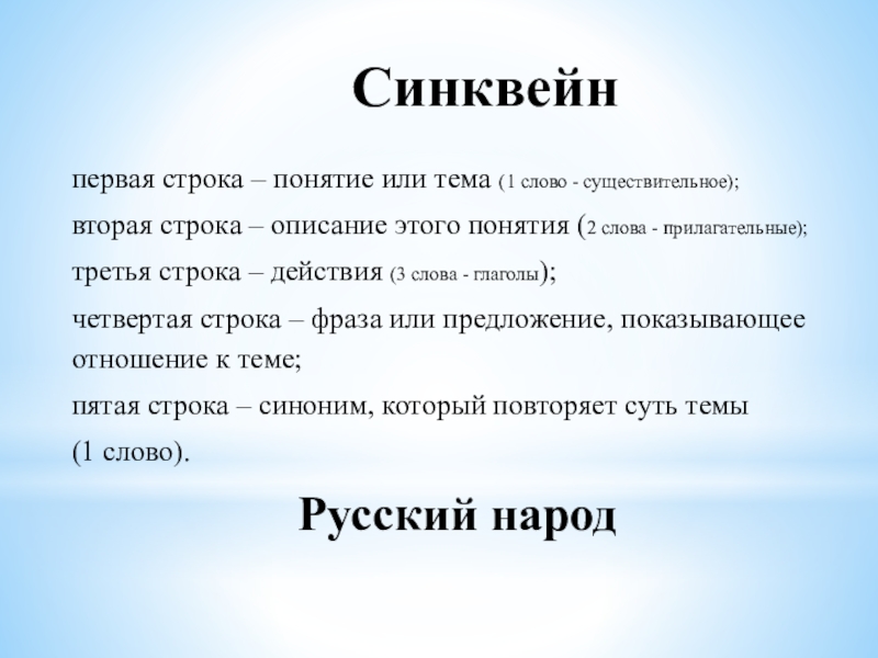 Синквейнпервая строка – понятие или тема (1 слово - существительное);вторая строка – описание этого понятия (2 слова