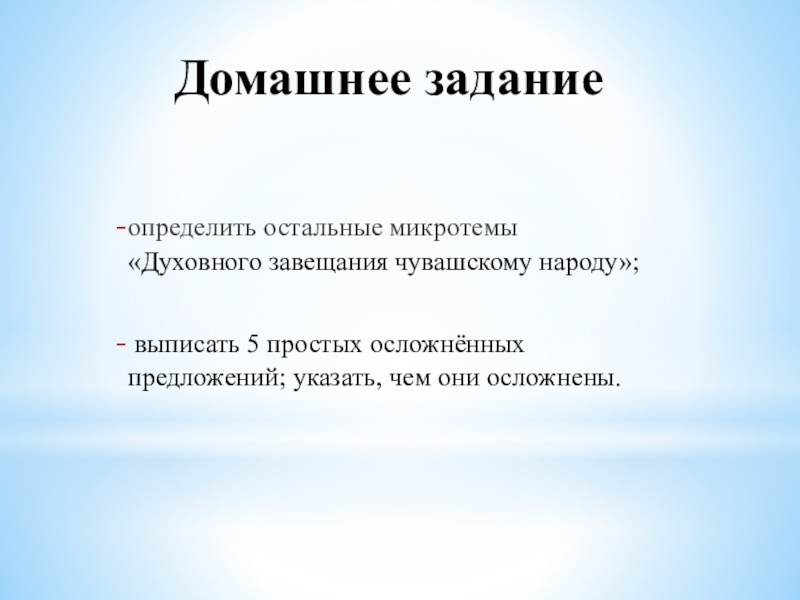 Домашнее заданиеопределить остальные микротемы «Духовного завещания чувашскому народу»; выписать 5 простых осложнённых предложений; указать, чем они осложнены.