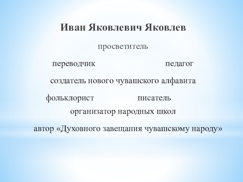 Иван Яковлевич Яковлевпросветительпереводчик педагогсоздатель нового чувашского алфавита фольклорист