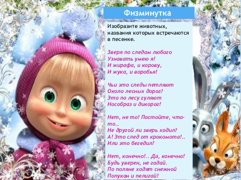 http://www.pesni.net/text/Iz-multfilma-Masha-i-medved/Novogodnyaya-pesnya песенки из мультфильма «Маша и Медведь».