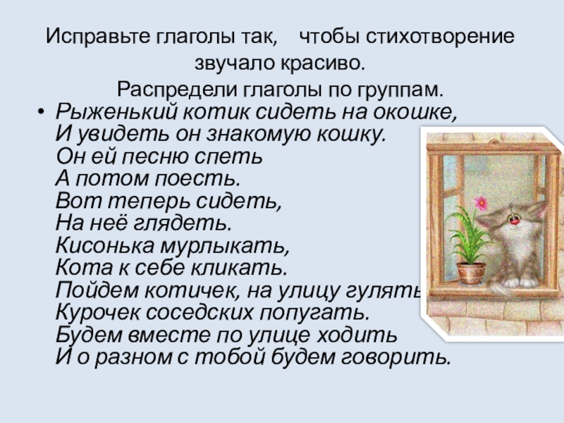 Исправьте глаголы так, 	чтобы стихотворение звучало красиво. Распредели глаголы по группам.  Рыженький котик сидеть на окошке,