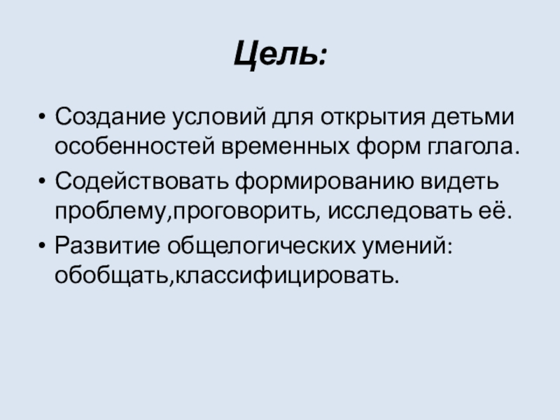 Цель: Создание условий для открытия детьми особенностей временных форм глагола. Содействовать формированию видеть проблему,проговорить, исследовать её. Развитие