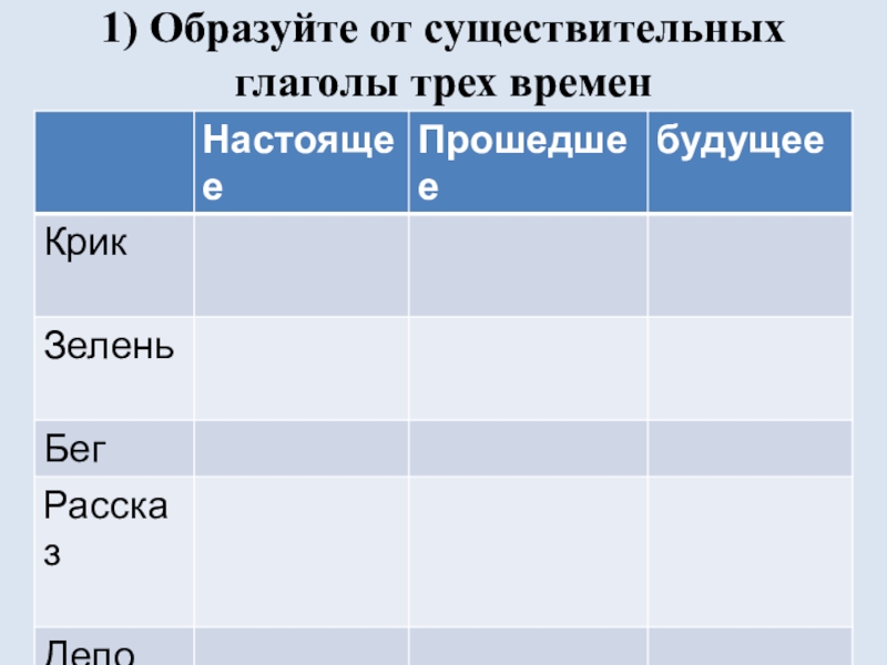 Слайд 71) Образуйте от существительных глаголы трех времен