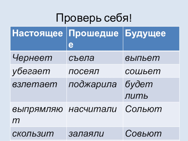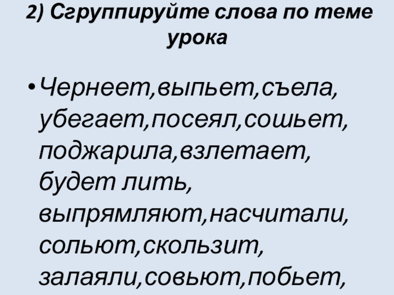 2) Сгруппируйте слова по теме урока  Чернеет,выпьет,съела,убегает,посеял,сошьет,поджарила,взлетает,будет лить,  выпрямляют,насчитали,сольют,скользит,залаяли,совьют,побьет,обмерил.