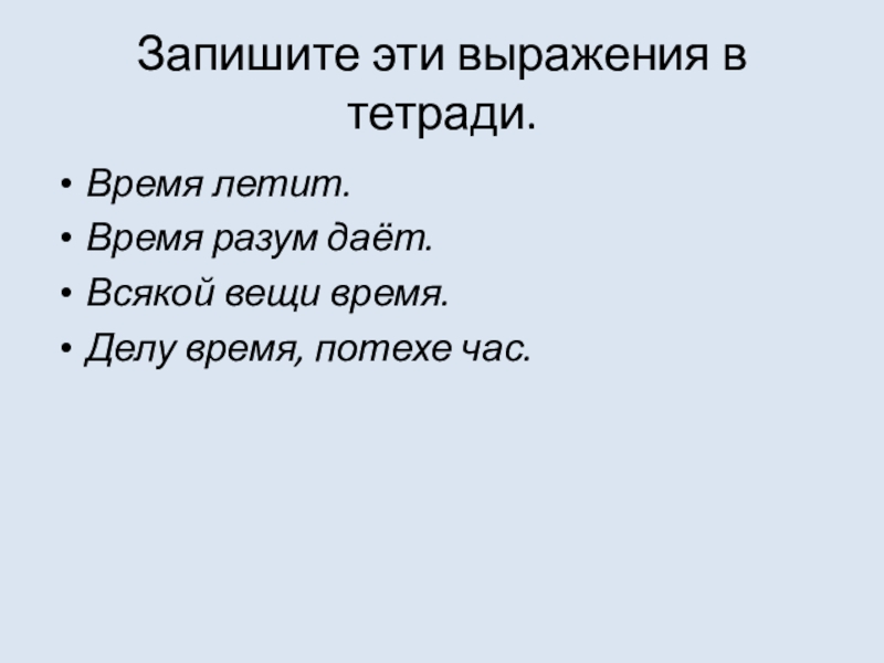 Запишите эти выражения в тетради.Время летит. Время разум даёт. Всякой вещи время. Делу время, потехе час.