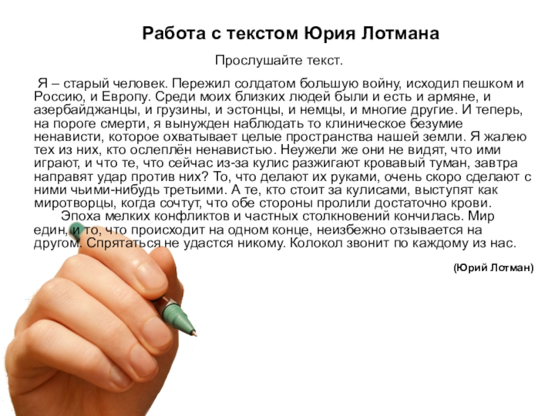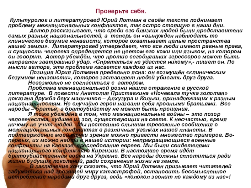 конфликтов, так остро стоящую в наши дни. Автор рассказывает, что среди его близких людей были представители самых разных национальностей, а теперь он «вынужден наблюдать то клиническое безумие ненависти, которое охватывает целые пространства нашей земли». Литературовед утверждает, что все люди имеют равные права, и сущность человека определяется не цветом его кожи или языком, на котором он говорит. Автор убеждён, что против сегодняшних агрессоров может быть направлен завтрашний удар. «Спрятаться не удастся никому»,- пишет он. По мысли автора, эта проблема касается каждого из нас. Позиция Юрия Лотмана предельно ясна: он возмущён «клиническим безумием ненависти», которое заставляет людей убивать друг друга. Невозможно не согласиться с автором. Проблема межнациональной розни нашла отражение в русской литературе. В повести Анатолия Приставкина «Ночевала тучка золотая» показана дружба двух мальчиков – Алхузура и Кольки, принадлежащих к разным национальностям. Не случайно герои назвали себя кровными братьями. Все народы – братья, а братоубийству не может быть прощения. Я тоже убеждёна в том, что межнациональные войны – это позор человечества, худшее из зол, существующих на свете. К несчастью, время ничему не учит людей. Мы постоянно слышим тревожные сообщения о межнациональных конфликтах в различных уголках нашей планеты. В подтверждение моей точки зрения можно привести множество примеров. Во-первых, их можно найти в нашей истории: непрекращающиеся военные конфликты на Кавказе, преследование евреев. Мы были свидетелями национального конфликта в Киргизии. В настоящее время идёт братоубийственная война на Украине. Все народы должны сплотиться ради жизни будущих поколений, ради сохранения жизни на земле. В заключение хочу сказать, что Юрий Лотман призывает читателей задуматься над грозящей миру катастрофой, остановить бессмысленное истребление народами друг друга, ведь «колокол звонит по каждому из нас»!
