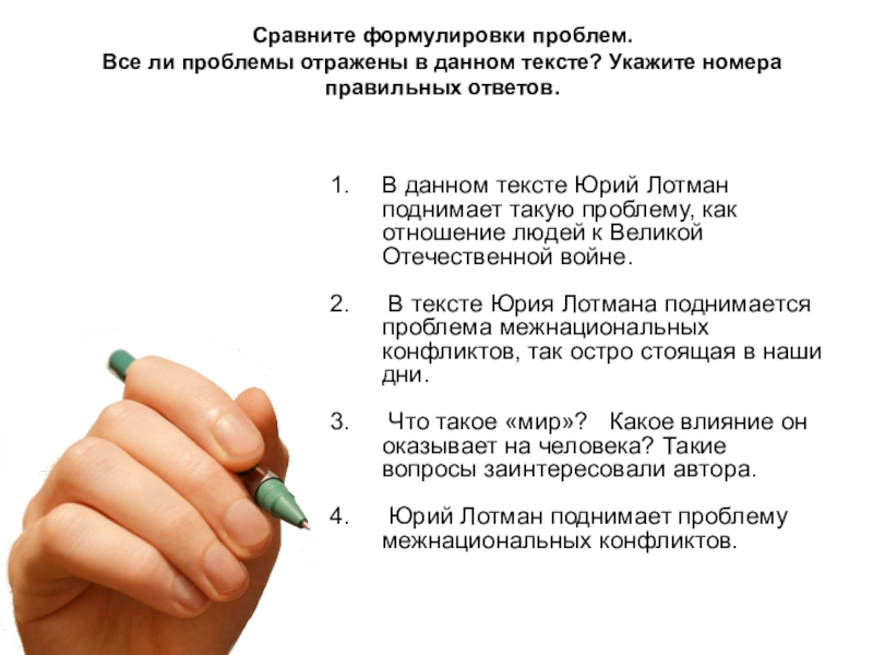 7. Итак, каждый из нас должен задуматься над тем, к чему призывает в тексте Юрий Лотман. Необходимо остановить бессмысленное истребление народами друг друга, восстать против тех, кто греет руки на убийстве людей. Все народы должны сплотиться ради жизни будущих поколений, ради сохранения жизни на земле.