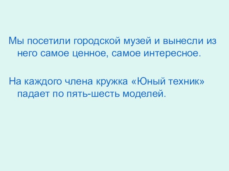 Мы посетили городской музей и вынесли из него самое ценное, самое интересное.На каждого члена кружка «Юный техник»