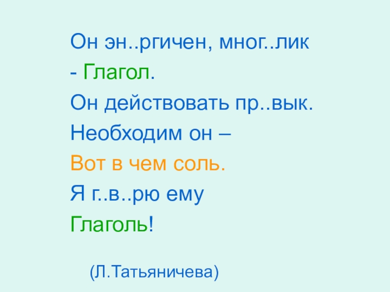 Он эн..ргичен, мног..лик- Глагол.Он действовать пр..вык.Необходим он – Вот в чем соль.Я г..в..рю емуГлаголь!