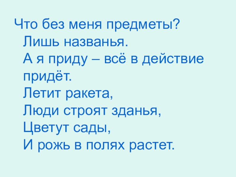 Что без меня предметы? Лишь названья. А я приду – всё в действие придёт. Летит ракета, Люди строят зданья, Цветут сады, И рожь в полях растет.