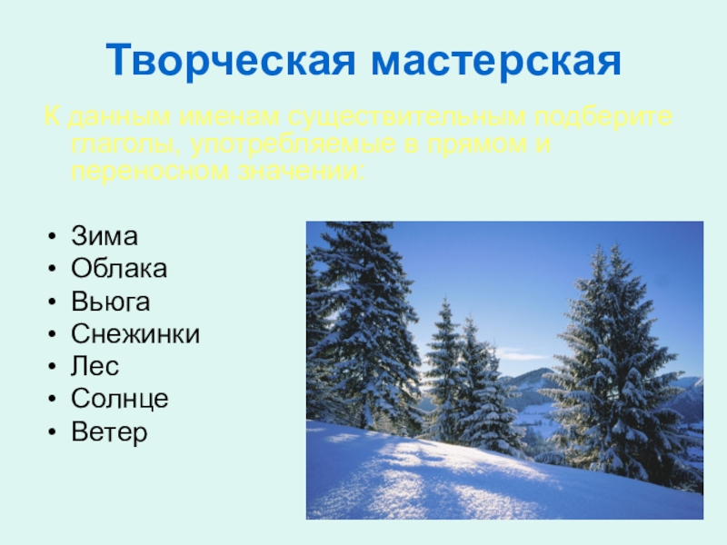 Творческая мастерскаяК данным именам существительным подберите глаголы, употребляемые в прямом и переносном значении:ЗимаОблакаВьюгаСнежинкиЛесСолнцеВетер