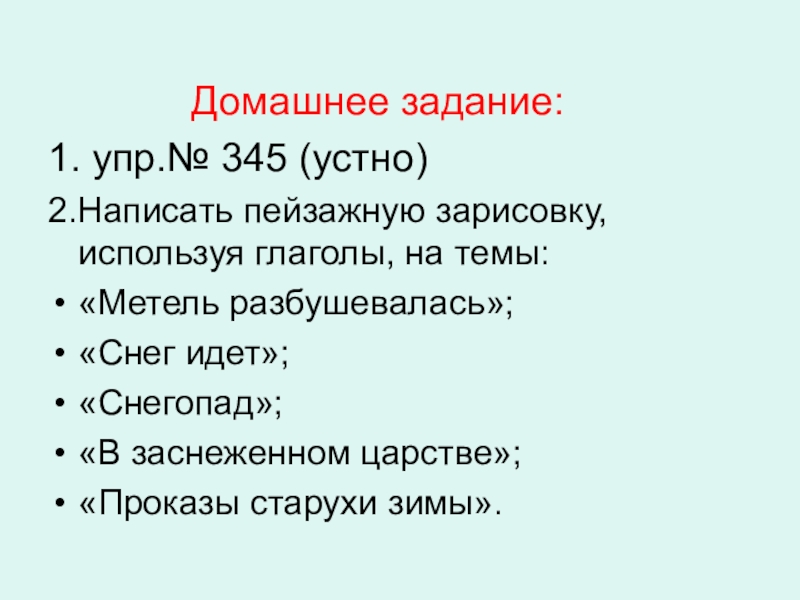 Домашнее задание:1. упр.№ 345 (устно)2.Написать пейзажную зарисовку, используя глаголы, на