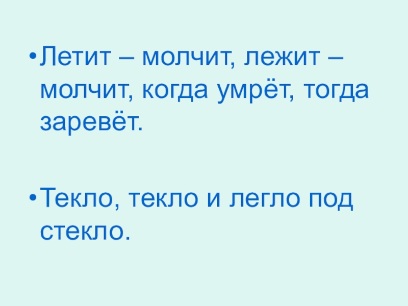 Летит – молчит, лежит – молчит, когда умрёт, тогда заревёт. Текло, текло и легло под стекло.