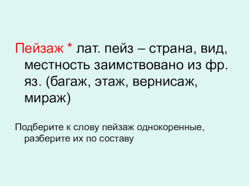 Пейзаж * лат. пейз – страна, вид, местность заимствовано из фр.яз. (багаж, этаж, вернисаж, мираж)Подберите к слову