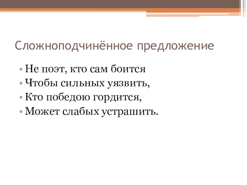 Сложноподчинённое предложениеНе поэт, кто сам боитсяЧтобы сильных уязвить,Кто победою гордится,Может слабых устрашить.