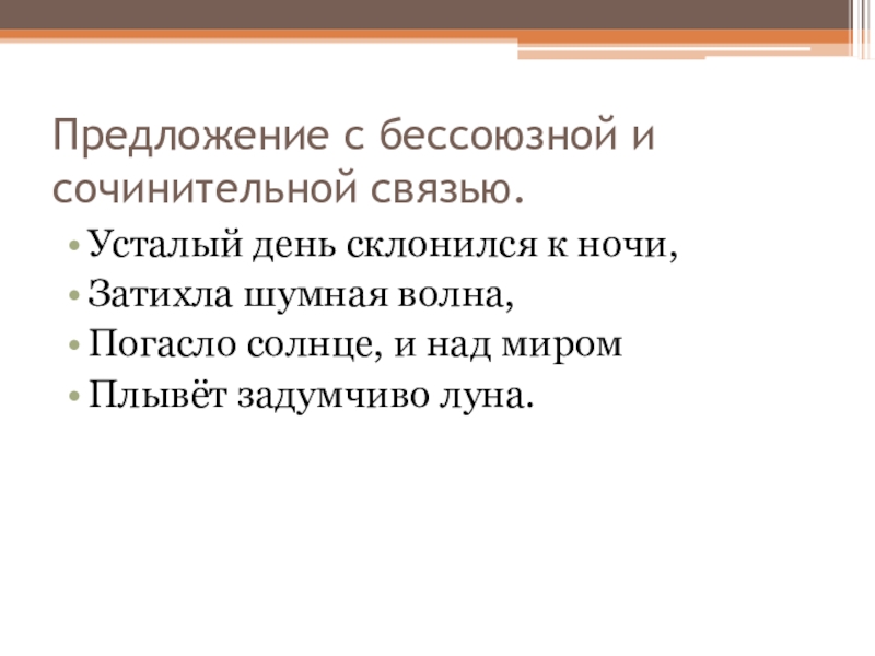 Предложение с бессоюзной и сочинительной связью.Усталый день склонился к ночи,Затихла шумная волна,Погасло солнце, и над миромПлывёт задумчиво