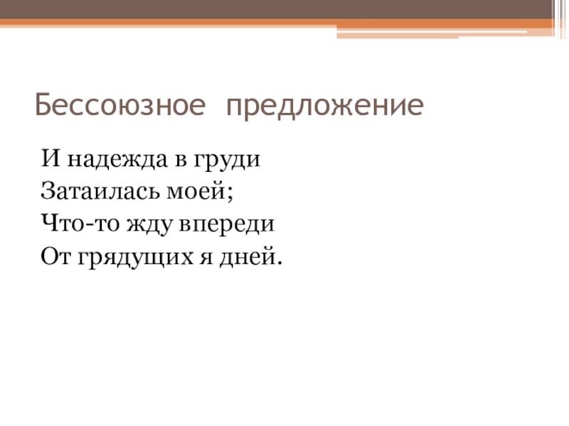 Бессоюзное предложениеИ надежда в грудиЗатаилась моей;Что-то жду впереди От грядущих я дней.