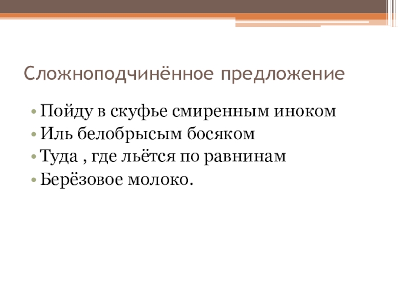 Сложноподчинённое предложениеПойду в скуфье смиренным инокомИль белобрысым босякомТуда , где льётся по равнинамБерёзовое молоко.