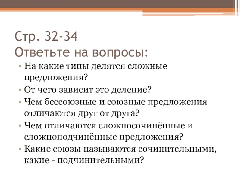 Стр. 32-34 Ответьте на вопросы:На какие типы делятся сложные предложения?От чего зависит это деление?Чем бессоюзные и союзные