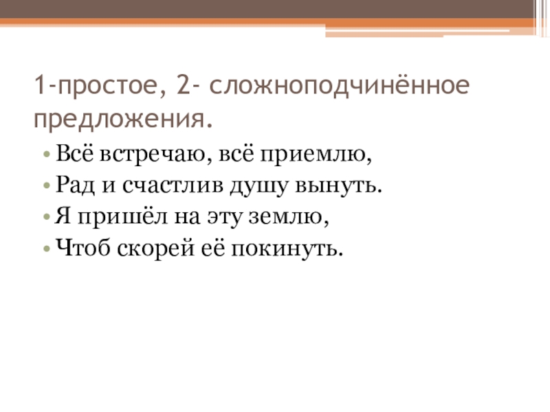 1-простое, 2- сложноподчинённое предложения.Всё встречаю, всё приемлю,Рад и счастлив душу вынуть.Я пришёл на эту землю, Чтоб скорей