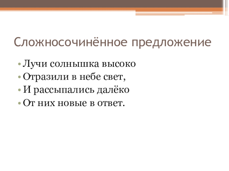 Сложносочинённое предложениеЛучи солнышка высокоОтразили в небе свет,И рассыпались далёко От них новые в ответ.