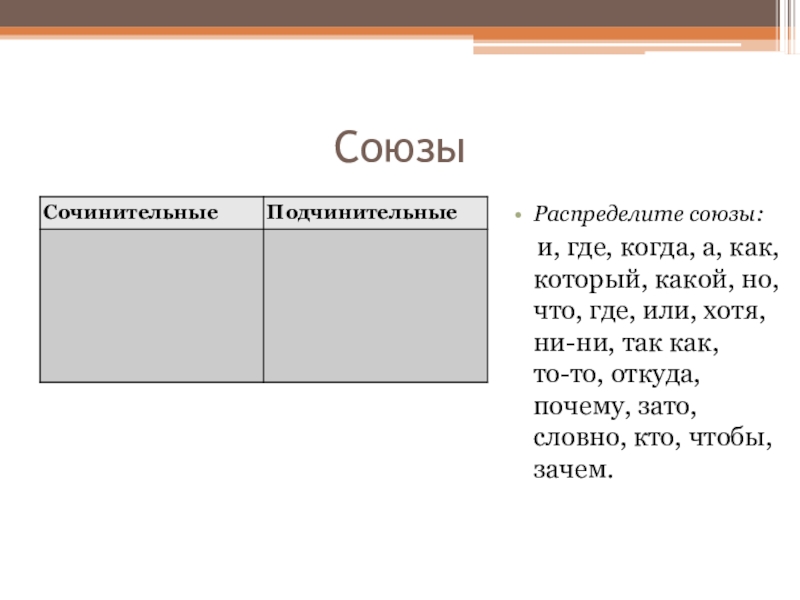 Союзы Распределите союзы:  и, где, когда, а, как, который, какой, но, что, где, или, хотя, ни-ни,
